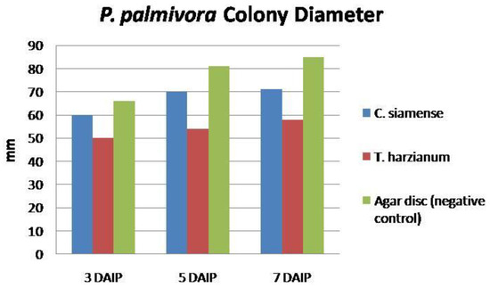 Mycelial growth (mm) of P. palmivora as affected by C. siamense at 3, 5 and 7 days after inoculation (DAIP).