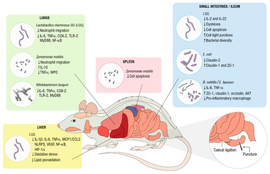 The impact of LGG administration on polymicrobial sepsis was also evaluated by Ding et al. [33], who determined whether this probiotic could modulate sepsis-related liver injury. Rats that received LGG (p.o.) once immediately prior to insult were protected from death caused by sepsis. The modulatory activities of LGG treatment in alleviating liver damage were associated with inhibition of the expression and/or release of IL-1β, IL-6, NLRP3 inflammasomes, TNFα, vascular endothelial growth factor, and monocyte chemoattractant protein 1, as well as the reduction of oxidative stress and lipid peroxidation. Furthermore, LGG downregulated NF-κB and hypoxia-inducible factor 1-α, indicating an important mechanism by which the probiotic alleviates a cytokine storm.
