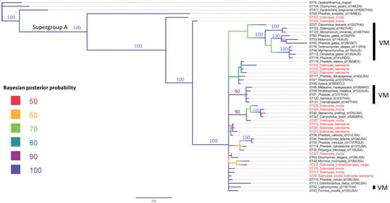 Bayesian inference of strains of Wolbachia in Formicidae. Note that most of them belong to supergroup A, with the exceptions of ST124 and ST471, which are classified in supergroup F, ST56 is are classified in supergroup B, and ST78 as outgroup (ST78). The terminals marked in red correspond to the STs detected in the present study. VM = Old World. The subsequent Bayesian posterior probability values are indicated according to the colors of the branches. However, numbers equivalent to high Bayesian posterior probability support (100 and 90) were also added to the nodes. Lower numbers have not been added for ease of viewing.