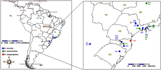 - Martins, C.; Souza, R.F.; Bueno, O.C. Molecular characterization of fire ants, Solenopsis spp., from Brazil based on analysis of mtDNA gene cytochrome oxidase I. J. Insect Sci. 2014, 14, 50. [Google Scholar] [CrossRef] [PubMed]