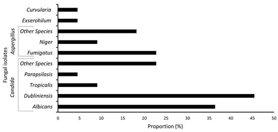 Twenty-two patients (70.9%) in our study population tested positive for fungal colonization. Eighteen of these patients carried the I1234V CFTR mutation, three carried the heterozygous (c.1657C>T and c.1115A>T) mutation, and one patient carried the homozygous (c.920G>A) mutation (Table 1). The two most common fungal pathogens were the Candida species (18 patients; 58.0%) followed by the Aspergillus species (10 patients; 32.2%) (Figure 1; Table S1). Within the 18 Candida patients, most cases were positive for C. dubliniensis (55.6%) followed by C. albicans (44.4%), C. tropicalis (11.1%), and C. parapsilosis (5.5%). Several other Candida species were also sporadically reported in 27.8% of the cases (Figure 1; Table S1). Conversely, the 10 patients who presented with Aspergillus colonization showed the highest frequency for A. fumigatus (50.0%) and A. niger (20%). The rest of the patients (40%) had different species of Aspergillus (Figure 1; Table S1). Additionally, only two patients (9%) had positive cultures with Curvularia and Exserohilum species (Figure 1; Table S1). Upon further investigation, our analysis revealed that more than one fungal species is colonized within individual patients (n = 12, 38.7%). Eight patients had two co-colonizing fungal species, whereas three patients had three fungal co-colonizing species, and one patient had four co-colonizing fungal species (Table S2). No specific combination of fungal co-colonization was noticed. In addition, we discovered that the majority of patients with fungal colonization (n = 11) were overweight with a BMI > 25, whereas most patients (n = 4) who did not have fungal colonization were within the normal BMI range (Table 1).