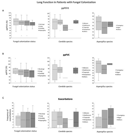 Our analysis showed differences in ppFEV1, ppFVC, and the number of pulmonary exacerbations values between the fungal and non-fungal group (Figure 2). Both ppFEV1 and ppFVC were lower in the fungal colonized group as compared to the non-colonized one. Indeed, the median ppFEV1 in both Candida and Aspergillus patients was 71%, while that of the non-fungal colonization group was 74% (Table S3). Similarly, the non-fungal group showed a better ppFVC profile (higher IQRs; upper quartile: 86.5%; lower quartile: 70.0%) in comparison to the fungal group (lower IQRs; upper quartile: 82.3; lower quartile: 67.8%) (Figure 2; Table S3). Specifically, Candida colonized patients showed the worst ppFVC median (73%), while the non-fungal group median was at 75% for example (Figure 2A Left Panel).