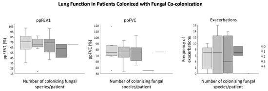 As the majority of CF patients were found to have been colonized with more than one fungal species (Table S2), we were interested to further analyze the effect of an increase in the number of colonizing species on lung function (Figure 3; Table S2). We found that patients (n = 10) colonized with one fungal species had a median ppFEV1 of 71% and ppFVC of 76%, whereas patients (n = 3) who were colonized with three fungal species had a drastically reduced median ppFEV1 (63%), as well as an even more significant decrease in ppFVC (45%). Contrastingly, we observed that the nine patients without fungal colonization had the best median ppFEV1 (76%) and ppFVC of 75%. Significantly, those patients who were free of fungal colonization, as well as those who were colonized with one or three different fungal species, had an equal median of exacerbations frequency (n = 7) (Figure 3 right panel; Table S2). While none of these values was statistically significant (p > 0.05), it is important to note that the clinical relevance of the noticeable reduction in ppFEV1 that is associated with the fungal co-colonization of three different species indicates some influence of these species on lung function of CF patients (Figure 3; Table S2).