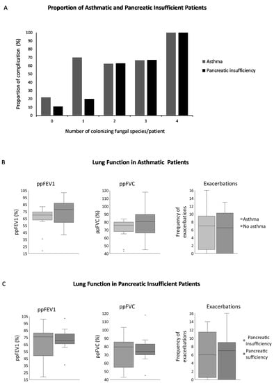 Complications in CF patients colonized with fungi species. (A): Bar graph illustrating the relationship between the number of fungal colonization isolated per adult CF patients in Qatar, and the proportion of complications (asthma and pancreatic insufficiency). (B,C): Box plots illustrating the medians, upper quartile, lower quartile, interquartile range, and overall ranges for the lung function within adult CF in Qatar, sorted by asthma (B) and pancreatic insufficiency (C). Dots outside of the box plots illustrate the outliers. Left panels: ppFEV1 levels (%). Middle panels: ppFVC levels (%). Right panels: exacerbations frequency.