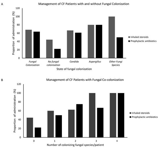 An important confounding factor in CF exacerbations is the use of antibiotics. Therefore, it was of our interest to analyze the management of this CF cohort in the presence or absence of fungal colonization. Two types of management were applied in this cohort, prophylactic antibiotics, and inhaled steroids. Our analysis showed that prophylactic antibiotics were more commonly administered by the CF patients with fungal colonization (n = 14; 63.6%) compared to those without fungal colonization (n = 2; 22.2%). A higher proportion of patients with Aspergillus colonization (n = 8; 80.0%) were given prophylactic antibiotics more often than those with Candida colonization (n = 11; 61.1%) (Figure 5A, Table 4). Similar to prophylactic antibiotics, inhaled steroids were found to be highly used among the fungi group (n = 15; 68.2%) as opposed to the non-fungal group (n = 4; 44.4%) (Figure 5, Table 4). Notably, a higher proportion of patients with Aspergillus colonization (n = 8; 80.0%) received inhaled steroids compared to Candida (n = 12; 66.7%) (Figure 5A, Table 4). When looking at how the type of management differed with fungal co-colonization, we noticed that the proportion of the administration of both inhaled steroids and prophylactic antibiotics increased with the number of colonizing fungal species per patient (Figure 5B). However, there was no statistical significance between the use of antibiotics or inhaled steroids and fungal colonization.