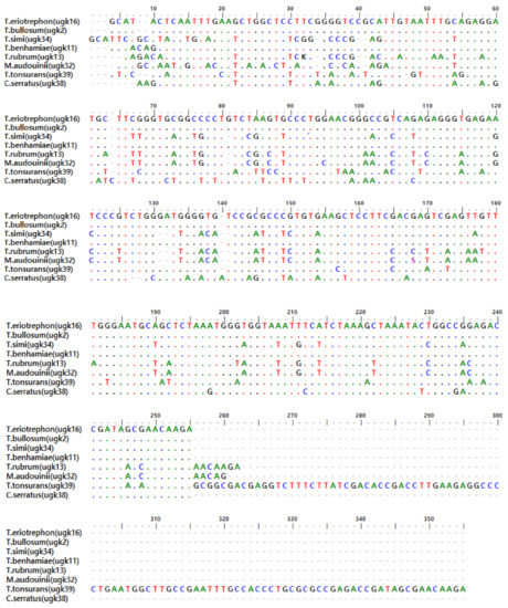 - Ahmadi, B.; Mirhendi, H.; Makimura, K.; de Hoog, G.S.; Shidfar, M.R.; Nouripour-Sisakht, S.; Jalalizand, N. Phylogenetic analysis of dermatophyte species using DNA sequence polymorphism in calmodulin gene. Sabouraudia 2016, 54, 500–514. [Google Scholar] [CrossRef] [PubMed]