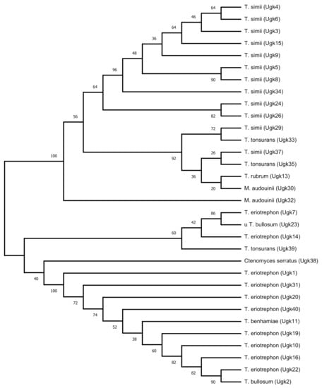 The differences in sequence length between the different dermatophytes are mainly due to length variation in the non-coding regions of an RNA transcript, or the DNA encoding it, which are eliminated by splicing before translation. The phylogenetic sequence analysis, as shown in Figure 2, shows a cluster consisting of both primary habitat (anthropophilic and zoophilic) of Trichophyton species, T. eriotrephon (Ugk 7, 14)/T. tonsurans (Ugk 39)/T. bullosum (Ugk 2), supported by a bootstrap value of 99%, and a cluster of zoophilic Trichophyton species of T. eriotrephon (Ugk10, 16, 19, 20, 22, 31, and 40)/T. benhamiae (Ugk 11)/T. bullosum (Ugk 2). There is also a cluster of primary habitat consisting of anthropophilic and zoophilic of both Trichophyton and Microsporum species M. audouinii (Ugk 32 and 30)/T. tonsurans (Ugk 33 and 35)/T. rubrum (Ugk13)/T. simii (Ugk 3, 45, 8, 9, 15, 24, 26, 29, 34, and 37) supported by a bootstrap value of 99%. This observation has shown a potential probability that the taxon has an animal-associated ancestry as their primary habitat. The lengths of 28S rRNA sequences of the different strains in a cluster consisting of Ugk 1, 31, 20, 11, 40, 19, 10, 16, 22, and 2 ranged from 247 to 250 bp (Table 3); thus, indicating that these species are very closely related. The biodiversity of differentiated species T. eriotrephon (Ugk 16) and T. bullosum (Ugk 2) showed 90% (0 bp difference) similarity. Our data suggest that 28S rRNA is not useful for species differentiation of T. eriotrephon (Ugk 22) and T. bullosum (Ugk 2), which are on the same internode (bootstrap value 90%) and, thus, needed an additional marker for accurate identification.