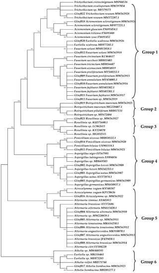 The phylogenetic analysis of the ITS-rDNA region was completed using our isolates and ITS sequences available in GenBank. The GenBank sequences were selected and based on the previous BLASTn results (Figure 1). The phylogenic relationship demonstrated that the isolates could be sorted into six groups (clades). The first group was composed of isolates Glinf009–Glinf013, Glinf018, Glinf020, and Glinf022, which all belonged to the Order Hypocreales. The second group was composed of isolate Glinf019, which belonged to the Order Sordariales. The third group was composed of isolate Glinf021, which belonged to the Order Xylariales. The fourth group was composed of isolates Glinf001–Glinf003, Glinf014 and Glinf015, which all belonged to the Order Eurotiales. The fifth group was composed of isolates Glinf004–Glinf008 and Glinf016, which all belonged to the Order Pleosporales. The sixth group was composed of isolate Glinf017, which belonged to the Order Atheliales. All the members of the Ascomycota produce an ascus that contains ascospores, and the members of Basidiomycota comprise fungi bearing the spores on a basidium. All the isolates belonged to the phylum Ascomycota with the exception of the isolate Glinf017, which belonged to the phylum Basidiomycota.
