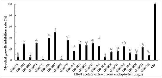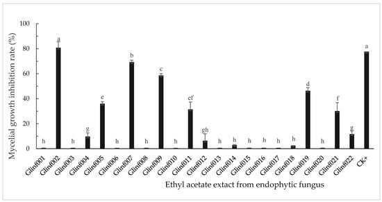 Mycelial growth inhibition of the ethyl acetate extracts from 22 endophytic fungal strains on R. solani. The error bars represent standard deviations from three independent samples. Different letters indicate statistically significant differences (p ≤ 0.05).