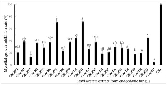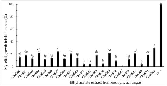 Mycelial growth inhibition of the ethyl acetate extracts from 22 endophytic fungal strains on U. virens P1. The error bars represent standard deviations from three independent samples. Different letters indicate statistically significant differences (p ≤ 0.05).