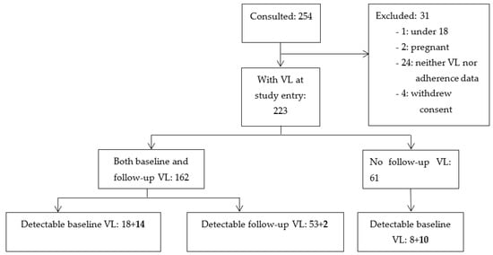 Patients were recruited into the study between May and July 2010. Samples were collected during a prospective cohort study involving first-line ARV users at Amana District Hospital Care and Treatment Center (CTC) in the Ilala Municipality in Dar es Salaam, Tanzania, as previously described [21,22]. A total of 254 randomly chosen patients was consulted for inclusion in the cohort (as described previously and in Figure 1). Selection criteria were either starting cART or being on a first-line ART for more than four months. Exclusion criteria were being below 18 years, pregnant, having opportunistic infections or malignancy. A total of 31 patients was excluded due to various reasons. A total of 223 patients was finally included, 26 of whom were cART-naïve and 197 of whom were cART-experienced for more than four months at enrolment. The follow-up samples were collected between May and July 2011.