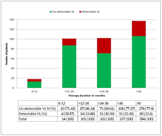 Taking only the 210 patients who were on therapy for at least six months, a total of 354 viral load measurements were available. These patients had been on treatment for a median (IQR) of 32 (22–44) months. A total of 80 (22.6%) patients had a detectable viral load (see Figure 3). The median (IQR) duration of therapy in the various time windows was 10 (8.25–11), 18 (15–22), 31 (28–34), and 48 (41–56) months for the one, two, three and more than three years groups, respectively. The proportion of patients with detectable viral load was: 28.57% in year 1, 13.86% in year 2, 30.39% in year 3, and 22.63% of those on therapy for more than three years. There was a significant positive correlation in the proportion of patients with detectable viral load with increasing exposure to therapy (p-value = 0.03) (Figure 3).