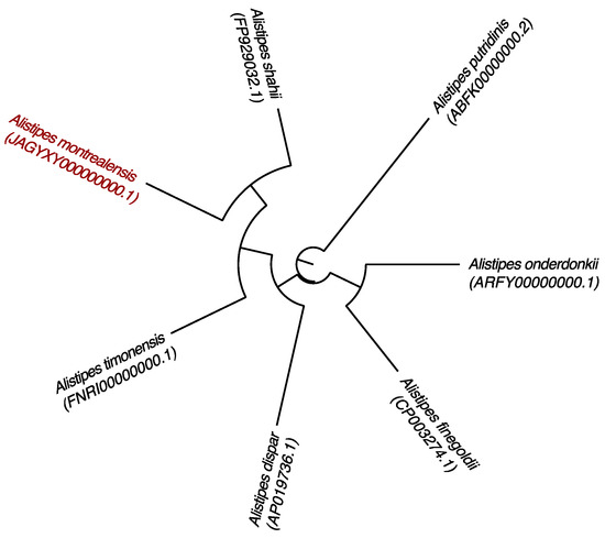 Phylogenetic tree highlighting the position of Alistipes montrealensis strain kh20T relative to other closely related strains. GenBank accession numbers for each 16S rRNA are noted in parenthesis. Sequences were aligned using Muscle v3.8.31 with default parameters and phylogenetic inferences were obtained using the neighbor joining method with 500 bootstrap replicates, using MEGAX software. The scale bar represents a 5% nucleotide sequence divergence.