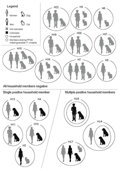 This study aims to evaluate the P. mirabilis fecal colonization and sharing between companion animals and humans that are living in the same household. Furthermore, the fecal P. mirabilis strains were compared by PFGE with clinical strains from companion animals and humans with UTI.
