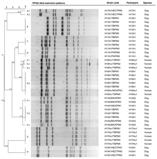 Indistinguishable and closely related P. mirabilis strains (91.7–100% Dice/UPGMA index) were also shared by the two dogs living in household H14 (Figure 2, Table 1). Here, the dog H14A2 presented a higher fecal burden than the dog H14A1.