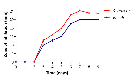 The optimum phase for production of the antibacterial secondary metabolites by the most active isolate—FUN01—was assessed as influenced by the elapsing time, and the results are presented in Figure 1. There were no zones of inhibition observed within 2 days of fermentation against S. aureus (ATCC 25925) and E. coli (ATCC 25922). This might have been due to the fact that the fungus was at the lag and exponential phases, during which the cells were metabolically active, synthesising primary metabolites responsible for its growth and not producing secondary metabolites. The zones of inhibition were observed after 3 days with the maximum zones shown at day 7 against both bacterial strains. However, the zones were more profound on S. aureus (ATCC 25925) than on E. coli (ATCC 25922), implying S. aureus (ATCC 25925) to be more sensitive to the produced secondary metabolites. After 7 days, the zones were constant on E. coli (ATCC 25922) and there was insignificant decrease at day 8 and 9 on S. aureus (ATCC 25925). The decrease might be due to autolysis that might have occurred as the nutrients depleted [43]. In addition, at day 7, the inhibitive intensity of the secondary metabolites in the broth implied that the fungus produced active antibacterial metabolites optimally at its stationary phase. The results are correlated by those of Khalil et al. [44], whereby Aspergillus strain CMB-M81F initiated the production of secondary metabolites with the transition to its stationary phase.