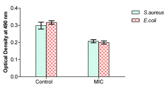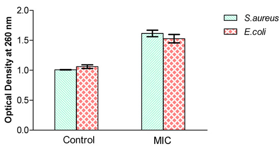 The cell membrane’s integrity is one of the major factors important for the microbial growth and metabolism process. The cytoplasmic contents are regarded as important units of microbial structural substances and their leakage can lead to microbial death [49]. Thus, the effect of the extract (MIC) on the integrity of the cell membrane was investigated and the results are shown in Figure 3. The OD260 values of S. aureus and E. coli treated with the MIC of the extract were 1.55 and 1.47, respectively. It is worth noting that the OD260 values of S. aureus and E. coli treated with the MIC were significantly (p < 0.05) higher than that of the controls, which were 0.85 and 1 for S. aureus and E. coli, respectively.