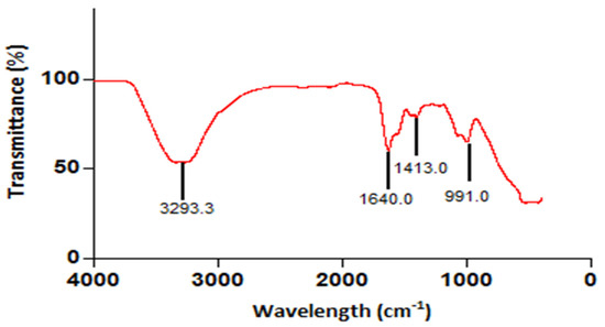 The functional groups of the extract were identified using FTIR and the results are illustrated in Figure 4. The extract showed strong and broad absorption at 3293.3 cm−1, as a result of O-H stretching and its compound class’s alcohol. The O-H group increases the polarity of molecules and improves their solubility in polar solvents [58]. Zhang et al. [59] pointed out that the antibacterial activities of some compounds are often due to the O-H group. There was also a strong absorption peak at 1640 cm−1, due to C=C stretching or N-H bending vibrations and its compound class’s alkene and amine groups. Alkene and amine groups are reported to possess antibacterial potency [60]. The extract further displayed a medium absorption peak at 1413 cm−1, as a result of O-H bending indicative of alcohol. Lastly, it revealed a strong absorption at 991 cm−1, due to C=C bending, corresponding to an alkene. Generally, it can be concluded that the presence of the observed characteristic functional groups could be responsible for the antibacterial activity of the fungal extract [61].