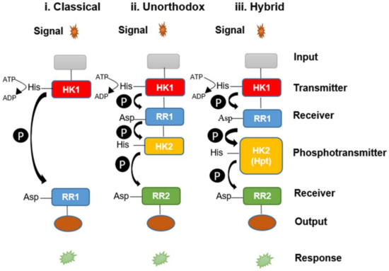 - Zschiedrich, C.P.; Keidel, V.; Szurmant, H. Molecular Mechanisms of Two-Component Signal Transduction. J. Mol. Biol. 2016, 428, 3752–3775. [Google Scholar] [CrossRef] [PubMed]