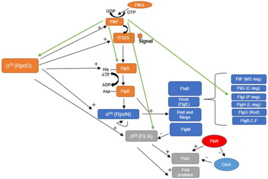 - Boll, J.M.; Hendrixson, D.R. A Regulatory Checkpoint during Flagellar Biogenesis in Campylobacter jejuni Initiates Signal Transduction To Activate Transcription of Flagellar Genes. mBio 2013, 4, e00432-13. [Google Scholar] [CrossRef]