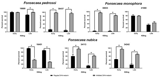 3.3. Most Fonsecaea spp. Strains with Inhibited DHN-Melanin Production Are Resistant to Micafungin Killing