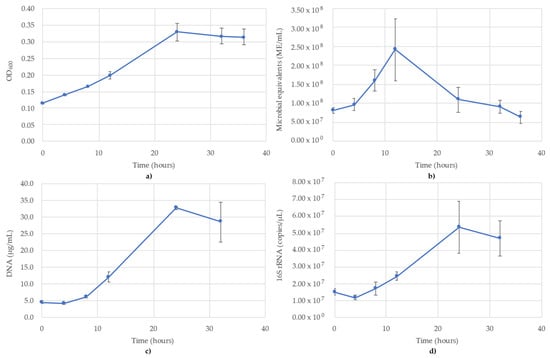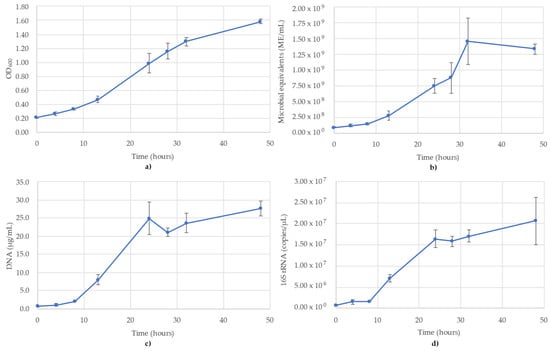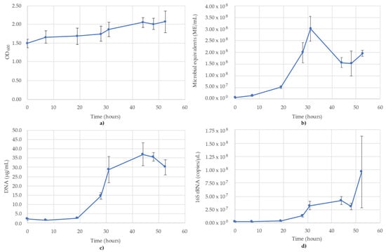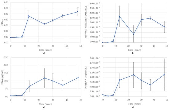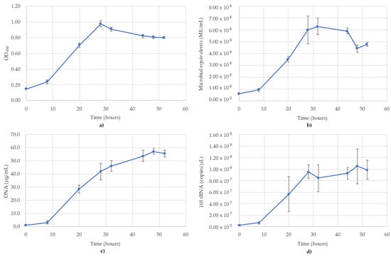 The results for the monitoring of the six pure cultures are shown in Figure 1, Figure 2, Figure 3, Figure 4, Figure 5 and Figure 6. In each case, the time course of the species was monitored using OD600, ATP (ME/mL), DNA (µg/mL) and 16S rRNA-targeted qPCR. The results of the ATP monitoring were calculated into microbial equivalents (ME/mL). Each of the three biological replicates collected at each time point were run in duplicate on the qPCR thermocycler, raising the trial’s N value to six for this line of monitoring. Error bars are the calculated standard deviation of the three biological replicates (six for qPCR). As our focus here is the comparison of the methods and the trends therein, the data from ATP and qPCR are not displayed in log scale in order to better illustrate the fluctuations, though the graphs in logarithmic scale are available in Supplemental Data Figures S1 and S2, respectively.