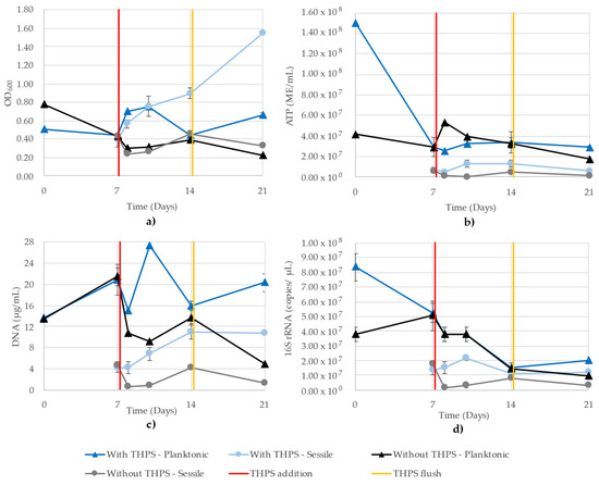 Planktonic and sessile growth monitoring of a mixed community grown in parallel CBR comprising D. vulgaris, G. subterraneus, P. putida and T. aromatica using (a) OD600, (b) ATP (ME/mL), (c) DNA (µg/mL) and (d) 16S rRNA (copies/µL). R2 values for the 16S rRNA qPCR standard curves were 0.960 and 0.979. One CBR received 37.5 ppm THPS on day 7 (red line) and both CBR were flushed on day 14 (yellow line).