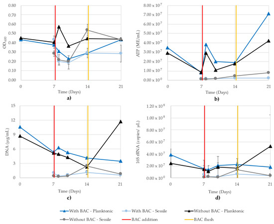 Planktonic and sessile growth monitoring of a mixed community grown in parallel CBR comprising D. vulgaris, G. subterraneus, P. putida and T. aromatica using (a) OD600, (b) ATP (ME/mL), (c) DNA (µg/mL) and (d) 16S rRNA (copies/µL). R2 values for the 16S rRNA qPCR standard curves were 0.971 and 0.993. One CBR received 1 ppm BAC on day 7 (red line) and both CBR were flushed on day 14 (yellow line).