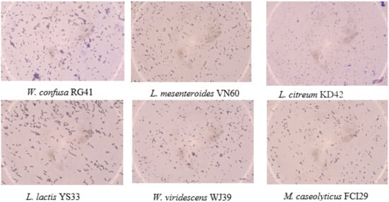 All six bacteria were cultured in MRS broth for 24 h at 28 °C. Cultured cells were fixed on slides using heat. Next, for 1 min, culture cells crystal violet was added to the culture cell section, and slides were briefly rinsed under running tap water to remove excess crystal violet. Gram iodine mordant was applied for 1 min to the culture cell section and briefly washed in tap water. To eliminate any non-specific crystal violet staining, a gram decolorizer solvent (acetone) was applied to the slides for 20 s and then quickly rinsed under running tap water. In addition, safranin was added for about 1 min and washed with water until clear. Finally, using a light microscope (×100), we examined the outcomes of the staining technique under oil immersion [,].