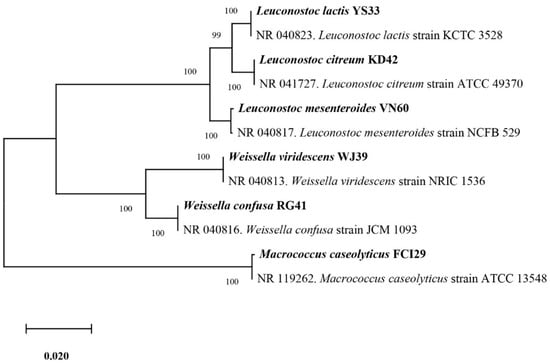 Six bacterial strains, VN60, FCI29, RG41, YS33, KD42, and WJ39, were isolated and identified from food waste. VN60 and FCI29 were isolated in LB medium and subcultured in MRS medium, while RG41, YS33, KD42, and WJ39 were isolated in MRS medium and subcultured in MRS medium. Figure 1 show the growth and morphologies of the colonies for all six strains during subculture on MRS agar at 28 °C for 24 h. Gram stain enables the identification of Gram-positive bacteria (Figure 2). The 16S rRNA gene of the isolates was subjected to basic alignment local tool (BLAST) analysis against the National Center for Biotechnology (NCBI) database. Strains VN60, FCI29, RG41, YS33, KD42, and WJ39, were identified as Leuconostoc mesenteroides, Macrococcus caseolyticus, Weissella confusa, Leuconostoc lactis, Leuconostoc citreum, and Weissella viridescens, respectively. Phylogenetic analysis based on the 16S rRNA gene showed that five of the bacteria belong to the order Lactobacillales, while FCI29 belongs to Bacillales. In addition, the phylogenetic tree (Figure 3) also revealed that Macrococcus caseolyticus FCI29 does not have a close relationship with the other five isolated bacteria. The 16S rRNA gene sequences of the six isolates (VN60, FCI29, RG41, YS33, KD42, and WJ39) were deposited in NCBI under accession numbers ON387328, ON387327, ON387326, ON387331, ON387330, and ON387329, respectively.