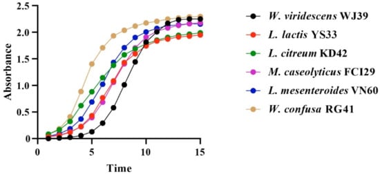 Bacteria isolated from food waste displayed growth rate values (µ) of 0.80 h−1, 0.79 h−1, 0.68 h−1, 0.66 h−1, 0.66 h−1, and 0.57 h−1 for W. viridescens WJ39, Weissella confusa RG41, Leuconostoc mesenteroides VN60, Leuconostoc citreum KD42, Leuconostoc lactis YS33, and Macrococcus caseolyticus FCI29, respectively. Our statistical results showed significant differences in the growth rates of the six bacteria (p < 0.05). According to our findings, the species from the Weissella genus exhibited a high growth rate, while the species from the Macrococcus genus showed a lower growth rate. Additionally, all bacteria reached an exponential stage within 15 h, and the progressive changes in optical density in the six bacterial species over time (h) are represented in Figure 4.