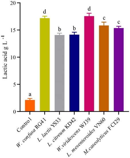 LA production potential of the bacteria at 24 h. The different letters denote a significant difference in the amount of LA production according to Duncan’s test (p < 0.05).