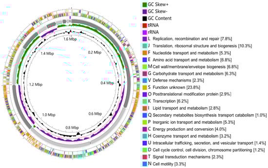 The diagram was generated using the CGView Server. It shows the predicted genomic features and composition for W. viridescens WJ39. From the inside to the outside are GC content, GC-skew, 16 contigs, RNA (rRNAs (purple), tRNAs (red)), the non-coding genes (antisense), coding genes (sense). The clusters of orthologous groups (COG) functional classification of coding genes is represented in different colors.