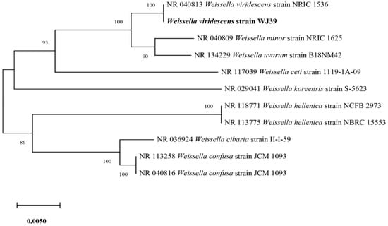 Phylogenetic tree based on the sequencing results of the 16S rRNA genes extracted from the genome shows the close relatives of W. viridescens strain WJ39.