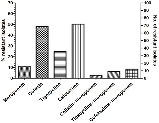 The distribution of antibiotic-resistant isolates among the Gram-negative bacterial isolates. A total of 141 Gram-negative bacteria were investigated in this study.
