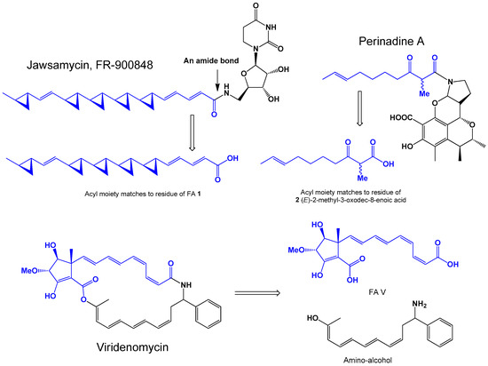 Viridenomycin, which also belongs to the class of amides, is represented by an acid (FA V) and an amino alcohol, demonstrates antineoplastic activity against sarcoma as well as its FA, although the amino alcohol shows antiviral activity against Arbovirus (data are shown in Table 1).