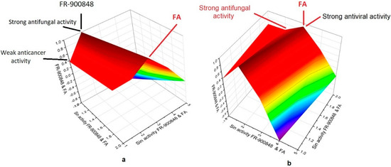 The 3D graph ((a), X and (b), Y views) shows the predicted and calculated antifungal, antiviral, and antineoplastic activities of FR-900848 and FA (1) showing the highest degree of confidence. The presented 3D graph demonstrates the comparative characteristics of the biological activities and the pharmacological profile of the individual fragments of the pseudopeptide referred to as FR-900848. In particular, the red zone of the 3D graph indicates the strong biological properties of both FR-900848 and its fatty acid. To build 3D graphs of the biological activity of fatty acids from natural amides, a proprietary computer program OriginPro 2021 was used, into which data were entered from another computer program PASS, which calculates the degree of reliability of biological activity.