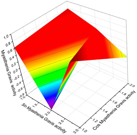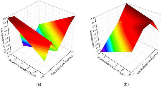 The 3D graph shows the predicted and calculated antiviral activity of FA (30, a). Limocrocin with this rare polyenoic FA, which contains seven conjugated carbon-carbon double bonds shows maximum UV absorption at 260, 420, and 440 nm, and exhibits strong antiviral activity against Arbovirus, and it is also a reverse transcriptase inhibitor. The 3D graph shows the predicted and calculated antidiabetic activity of FA (31, b). Complex molecules of antimycin and closely related antibiotics that contain (S)-2-((1S,2R)-1,2-dihydroxypropyl)-octanoic acid (31) exhibit antidiabetic properties.