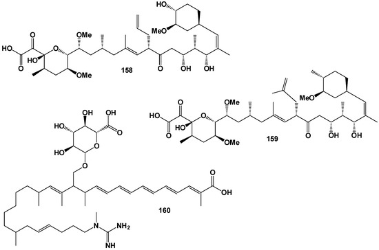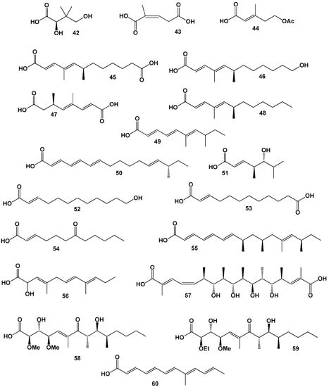 Bioactive compound JBIR-66 with (3E,6E,8E)-2-hydroxy-4,8-dimethylundeca-3,6,8-trienoic acid (56) was obtained from the culture broth of the tunicate-derived fungus Saccharopolyspora sp. SS081219JE-28 [72]. Two β-hydroxy acetamides, BE-52211, BE-52211 B, and BE-52211 C, as structural analogues of JBIR-66, were obtained from Streptomyces sp. They inhibited cell division of starfish embryos at a concentration of 2.5 μg/mL and contain acid (56) [73,74].