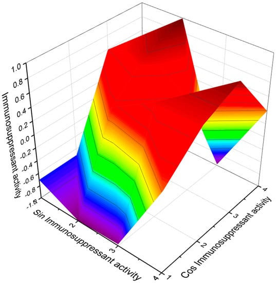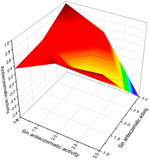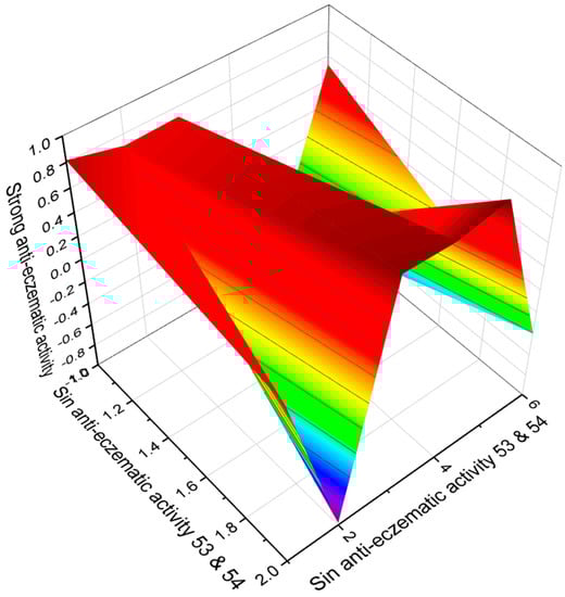 The 3D graph shows the predicted and calculated anti-eczematic activity of FA (53 and 54). Both acids have been found in the insect pathogenic fungus Isaria tenuipes. It is known that this fungus is one of the potent species of the Isaria genus, which is known to have many biologically active substances of therapeutic value. In addition, the crude methanol extract showed potent antioxidant and antiproliferative activity, which is indicative of natural antioxidant and antiproliferative agents.