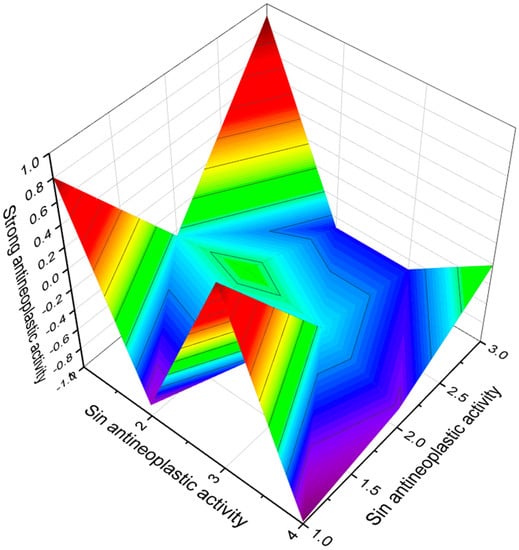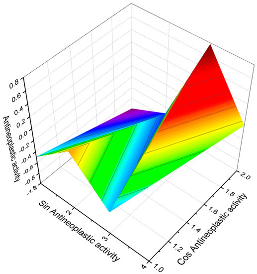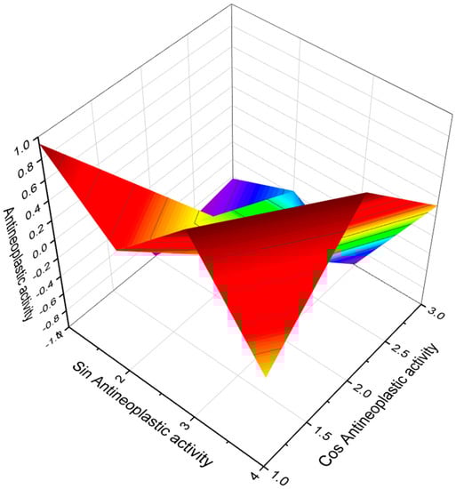 The 3D graph shows the predicted and calculated antineoplastic activity of FA (73, 74, 75, and 76). These FA contain amides that are synthesized by the gram-negative rod-shaped myxobacteria, Myxococcus xanthus. With an excess of nutrition in cultivated conditions, this bacterium exists in the form of a predatory, saprophytic single-species biofilm called a swarm.