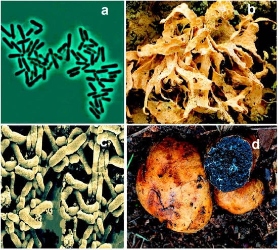 Examples of fungal endophyte, Streptomyces aureus (a), pathogenic fungus Bipolaris spp (b), and discomycete Trichopeziza mollissima (c), which produce bioactive FA amides. Among the microbial species cited, of great interest are Discomycetes, which include cup fungi, spongy fungi, and brain fungi, as well as some club-shaped fungi. In recent years, interest in these fungi has grown as they are a source of biologically active metabolites, including amides. Among the Discomycetes, saprobionts predominate, which grow in conditions of high soil moisture, humus, and on dead wood. They are typical cups or discs, but other forms such as sponges, saddles, tongues, and bells are not uncommon. The pictures (c) show varieties of Trichopeziza mollissima.