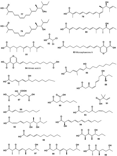 The polyene antifungal antibiotics, 6E,2′-O-methylmyxalamide D, 6E,10Z-2′-O-methyl-myxalamide D, 2′-O-methyl-myxalamide D, and acetate derivative of (77) have been obtained from myxobacterium Cystobacter fuscus AJ-13278, contained FA (78), (79), and (80), respectively [89]. All compounds showed antifungal activities of against the phythopathogenic fungus Phythopthora capsici.