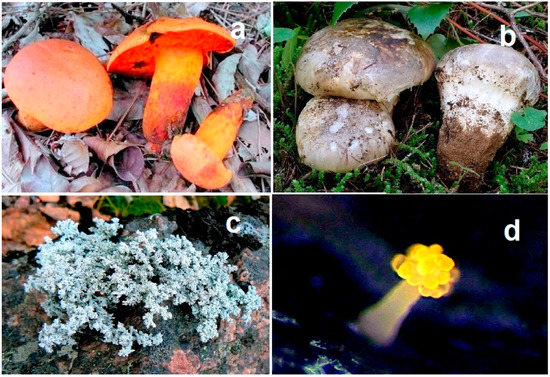 Examples of Japanese mushroom Boletus laetissimus (a), mushroom Catathelasma ventricosum (b), Antarctic lichen Stereocaulon alpinum (c), and a mesophilic proteobacterium Chondromyces sp. (d) which contain bioactive FA amides.