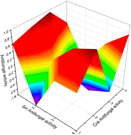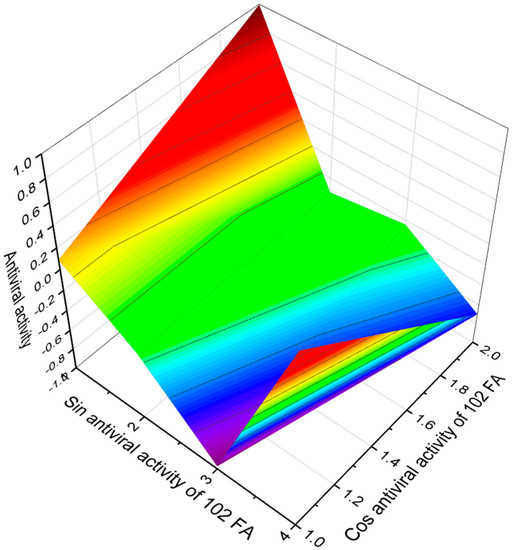 From the culture solution of Streptomyces limosus was obtained a yellow crystalline, nitrogenous dye stuff that limocrocin was isolated [45]. Rare polyenoic (2E,4E,6E,8E,10E,12E,14E)-hexadeca-2,4,6,8,10,12,14-heptaenedioic acid (30) is present in limocrocin. Figure 6 demonstrates in a 3D graph the predicted and calculated antiviral activity of a rare FA (30), and activity is presented in Table 2.