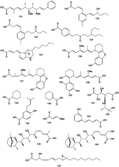 Manumycin A contain (R,2E,4E)-2,4,6-trimethyldeca-2,4-dienoic acid (11), which was found in chinikomycin A and B. Antibiotic U-56407 was isolated from fermentations of Streptomyces hagronensis (strain 360) with (E)-4,6,8-trimethyl-nona-2,7-dienoic acid (14) was active in vitro against gram-positive bacteria [35].