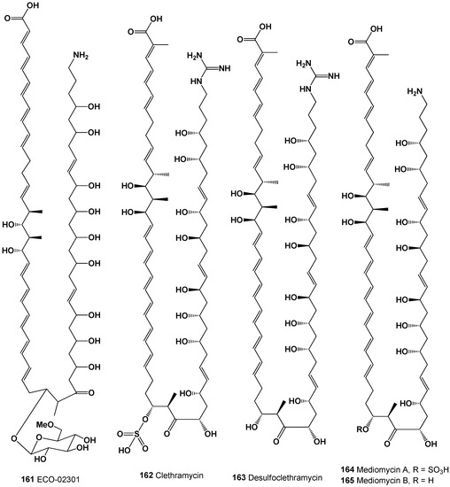 - Ikeda, Y.; Kondo, S.; Naganawa, H.; Hattori, S.; Hamada, M.; Takeuchi, T. New triene-beta-lactone antibiotics, triedimycins A and B. J. Antibiot. 1991, 44, 453–455. [Google Scholar] [CrossRef]