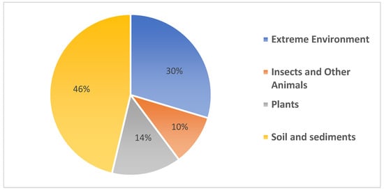 As with other samples, to isolate Streptomycetes from insects, different carbon sources (humic acid, starch, methylcellulose and oats) can be added to the isolation media [,,,] as well as cycloheximide and nalidixic acid have been the main supplements in isolation settings [,,,,]. Unlike samples from plants and extreme environments, only two different pretreatment procedures have been applied to insect-derived samples from the data collected, which include physical pretreatment where the sample was shaken in a rotary shaker at 180 r.p.m. at 28 °C for 30 min [,,,,], or a chemical pre-treatment where samples were surface sterilized in 70% ethanol [].