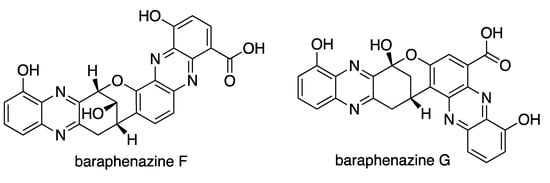 - Wang, X.; Abbas, M.; Zhang, Y.; Elshahawi, S.I.; Ponomareva, L.V.; Cui, Z.; Van Lanen, S.G.; Sajid, I.; Voss, S.R.; Shaaban, K.A.; et al. Baraphenazines A–G, Divergent Fused Phenazine-Based Metabolites from a Himalayan Streptomyces. J. Nat. Prod. 2019, 82, 1686–1693. [Google Scholar] [CrossRef]