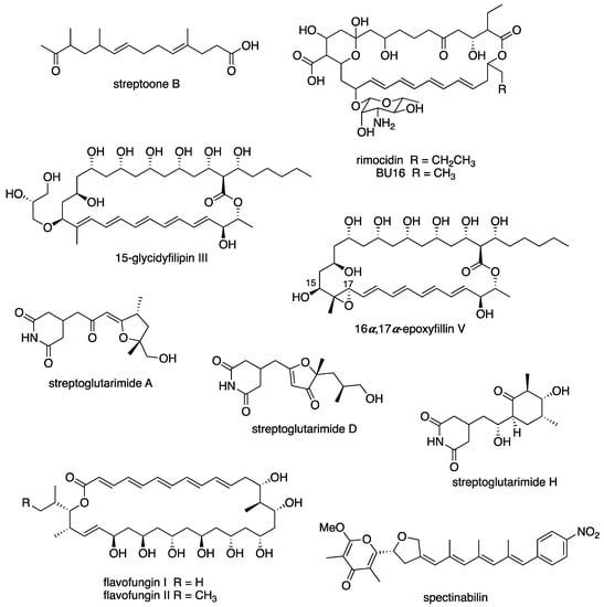 An interesting recent study by Laskaris et al. (2021) on “Streptomyces, Greek Habitats and Novel Pharmaceuticals: A Promising Challenge” did an excellent job of reporting compounds from Greek Streptomyces including antibiotics, antitumor compounds, biofilm inhibitors, antiparasitics, bacterial toxin production inhibitors and antioxidants []. Their work showed that Streptomyces is still a large current producer of bioactive compounds.